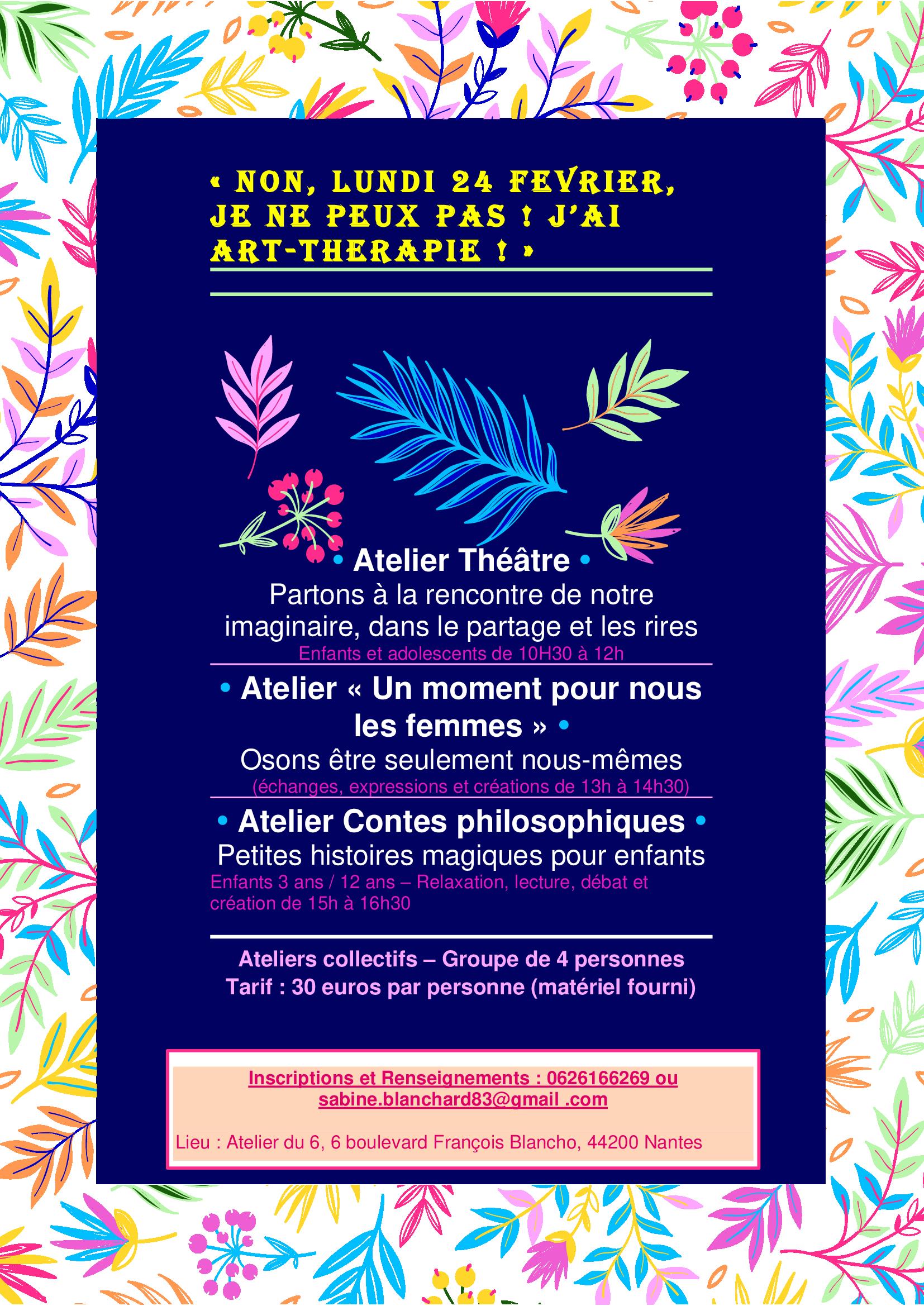 Les ateliers proposés sont un moment de bien-être, une parenthèse pour VOUS, explorer vos ressentis à travers votre créativité. Photographie, vidéo, dessin, peinture, écriture, modelage, expression corporelle sont des médias à votre disposition après un temps de relaxation et ensuite de verbalisation.